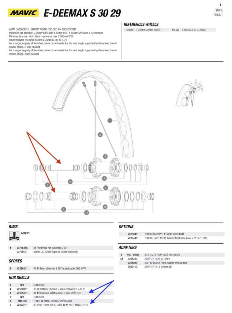 If we look at the exploded diagram in more detail (image below) we can see that this Front Wheel is available in two configurations ; either a 15x110mm Boost axle or a 20x110mm Boost axle.