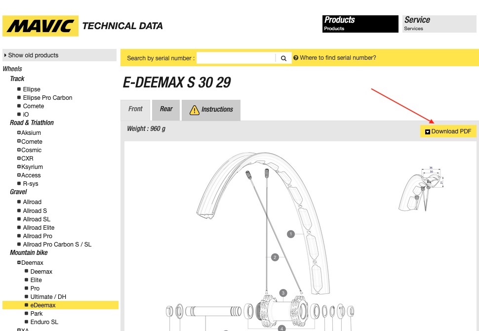 We need to obtain the model year of the wheels – to do this click the “Download PDF” link  (arrowed in image below), this will open up the relevant page in the technical documentation with the model year in the top right hand corner (arrowed in image below)